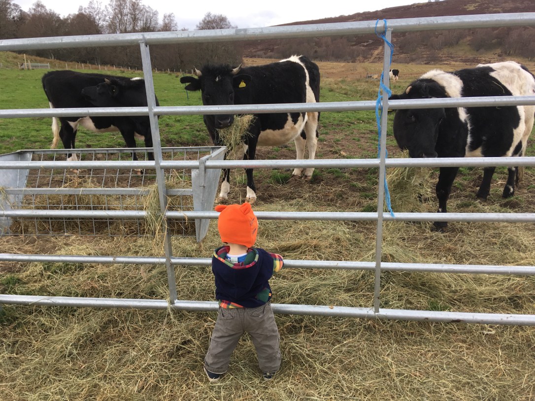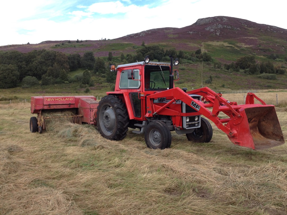 OK, a tractor (with loader) and a baler. The tractor had been bought at Dingwall Mart’s Implement Sale (yes, women buy implements, even if auctioneers keep saying ‘boys, boys, boys’ at the mart). Because what else do you go and buy when you realise you are pregnant? Yep, not just a tractor (we had one) but one with a front loader. Because up until then we used a bale spike on the back of our dexta and we lifted the ring feeder up to put the hay in. Correct, no ‘heavy’ lifting while pregnant yet the job was mine while the Crofter went to work and we knew that going into winter I would need something.