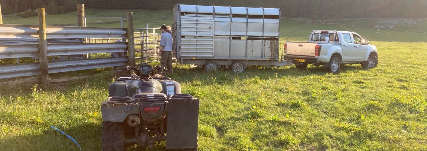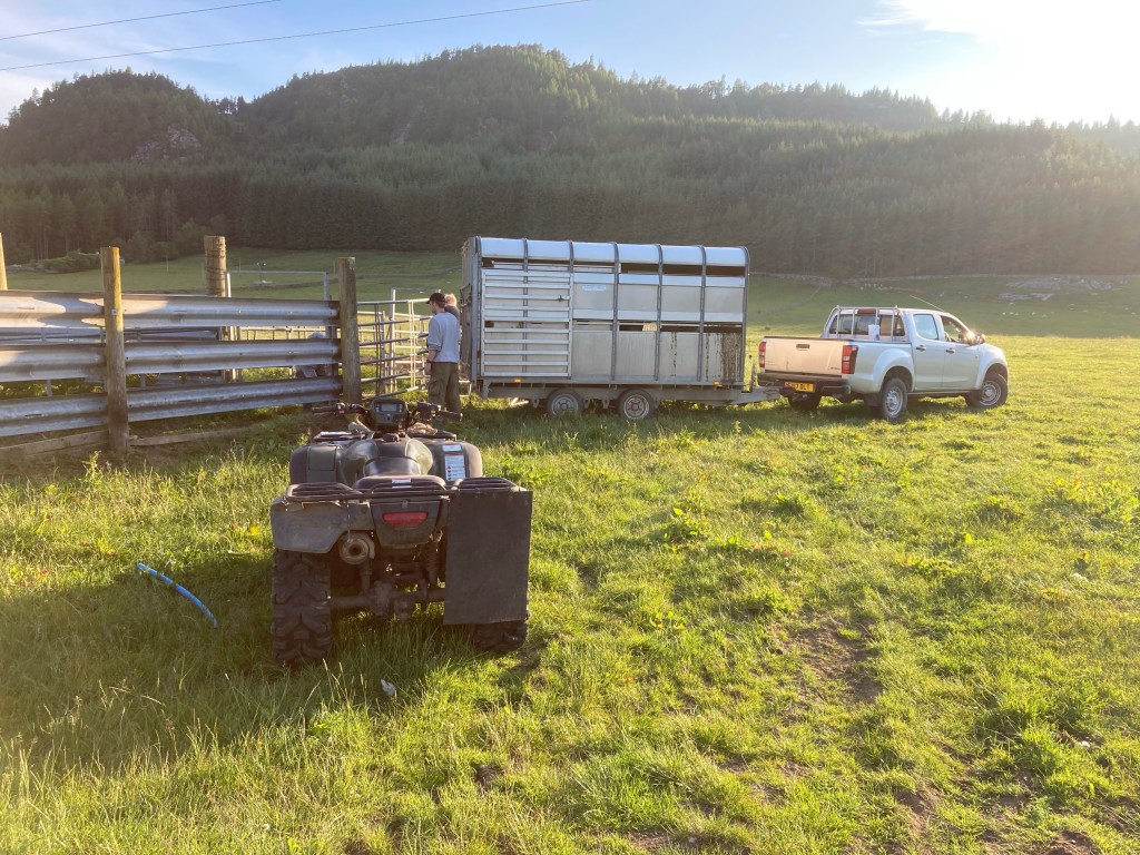While the steer headed back to eyeing up jumping over the stone dyke; some old fence posts were uprooted to enable the fence to be pushed down to give space for him to step over. I exited the field while the Crofter and two other brave men tried one last chance. Thankfully, Jack D saw the opportunity and took it. And while he looked thankful to be back in his own field, he was now searching for pals. He didn’t want to be on his own. But while he wanted a support group, we left him to chill, praying that he wouldn’t try jumping again. Now, this all happened when we had a slot booked for the following day for a steer to go to the abottoir. And his name was now on it…if we could get him loaded.